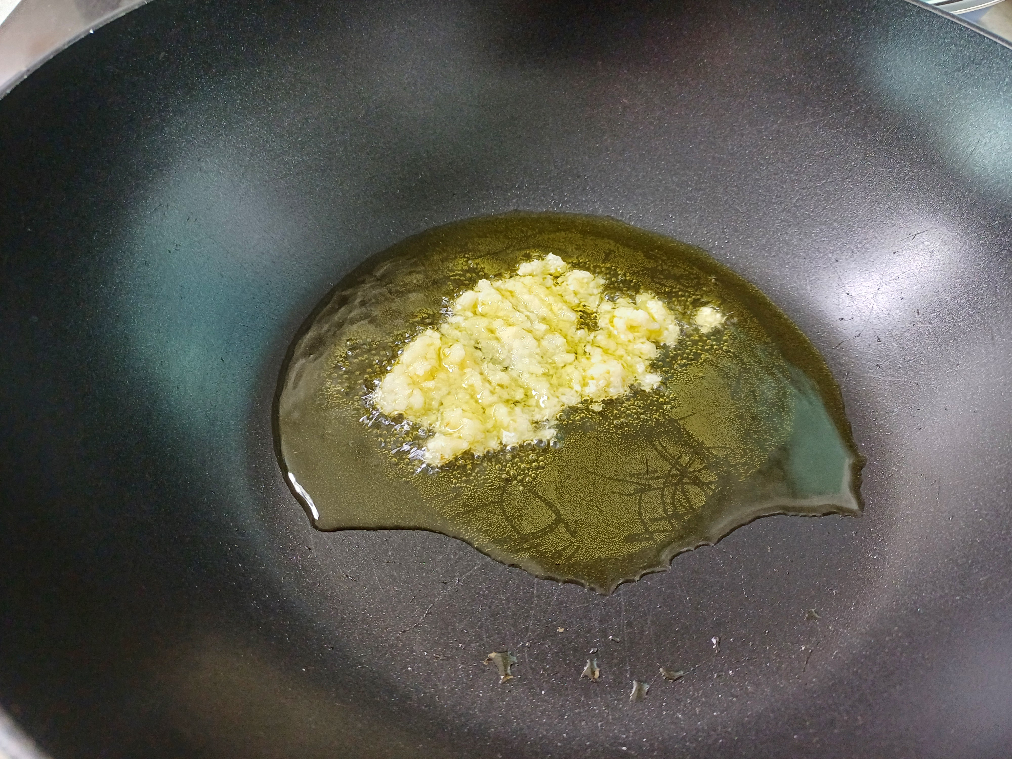 3. 가열된 후라이팬에 기름을 두르고 마늘을 넣어 향을 냅니다.