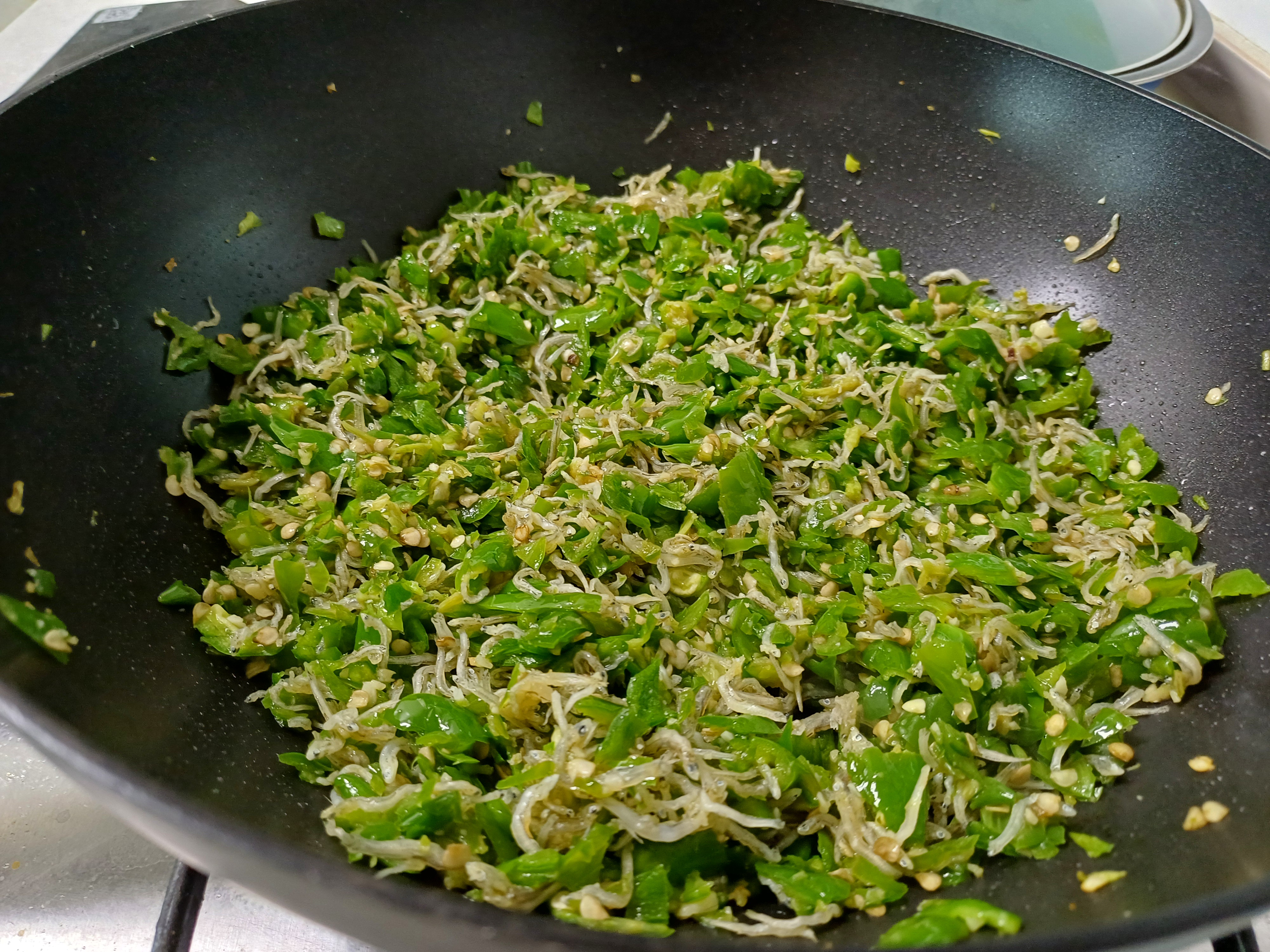 6. 멸치와 다진 고추를 잘 섞으며 볶습니다.