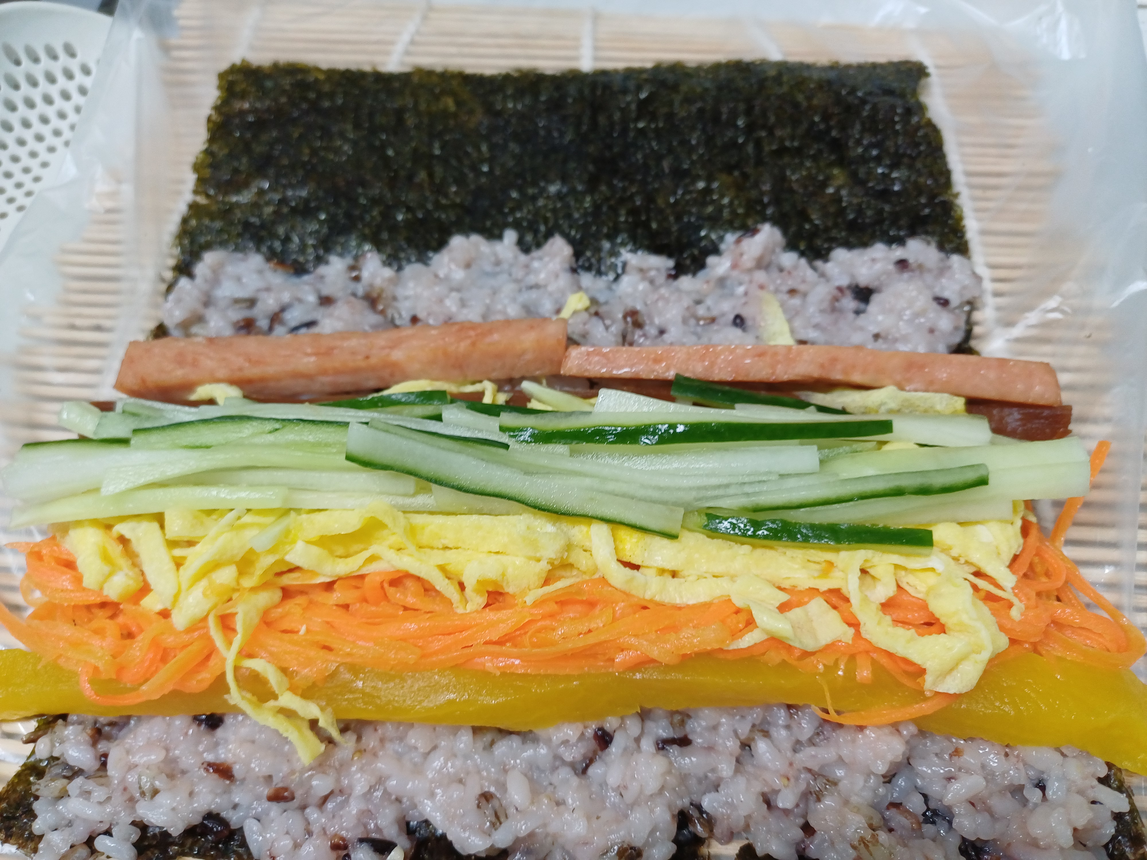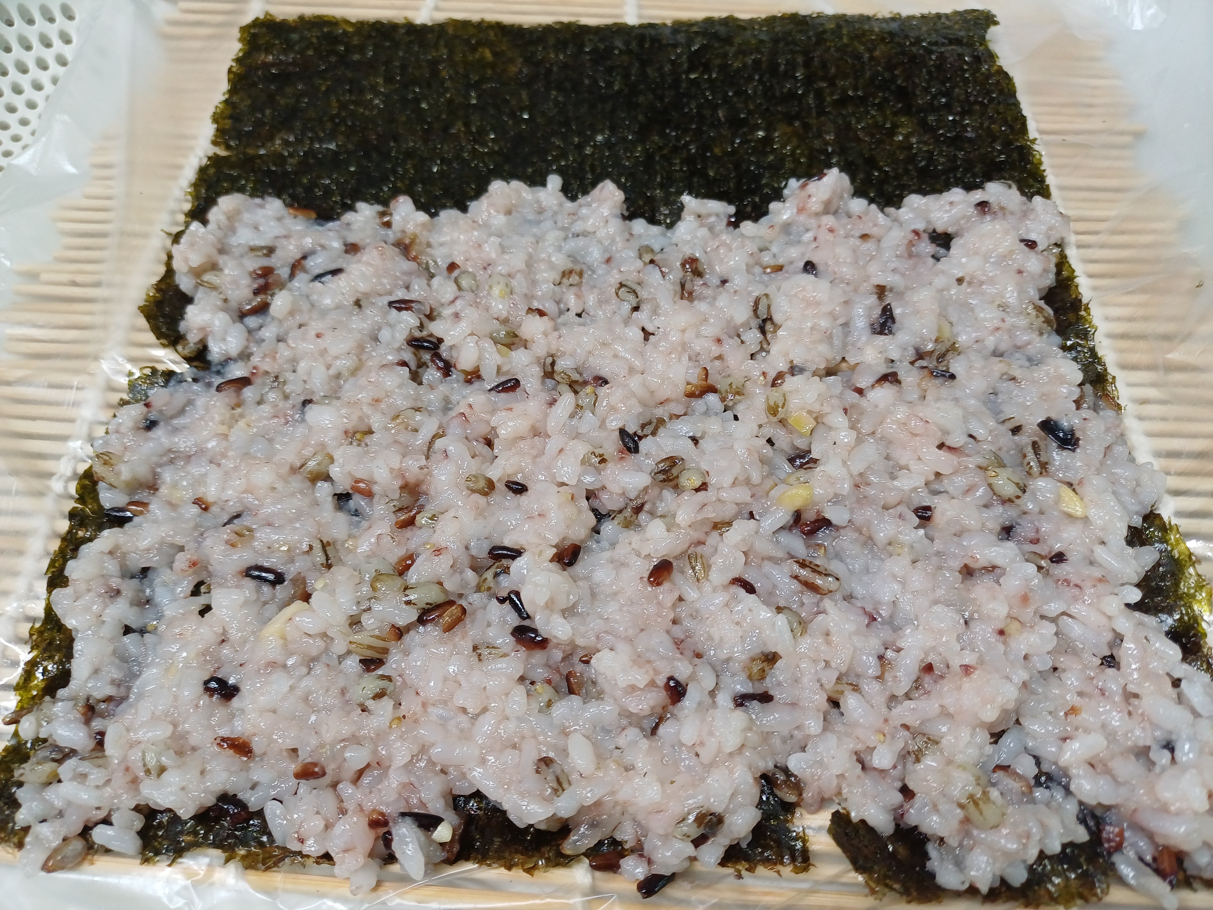 8. 김발 위에 김을 깔고 밥을 얇게 편다.