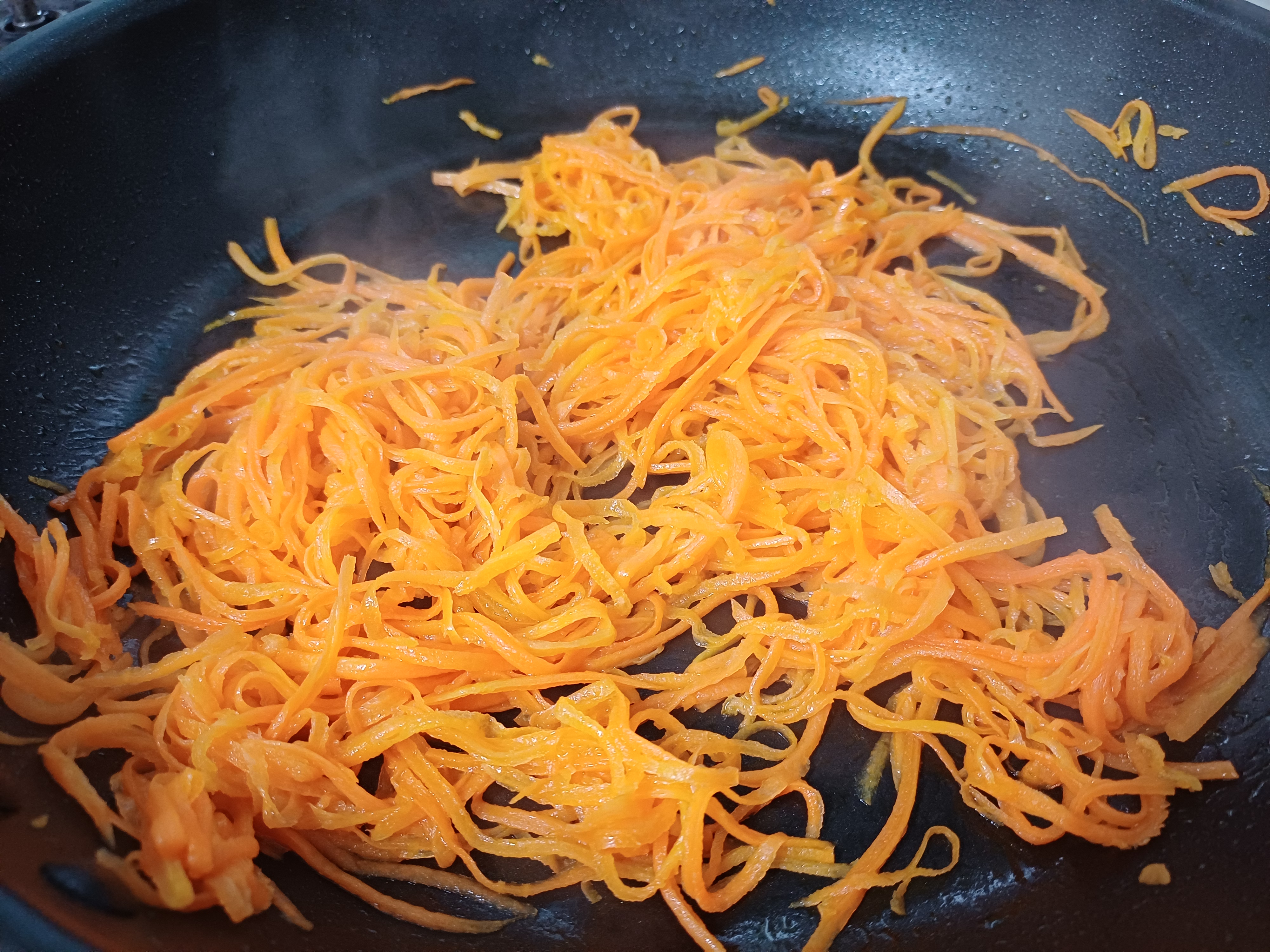 5. 후라이팬에 기름을 두르고 채 썬 당근에 소금 한 꼬집 넣고 볶는다.