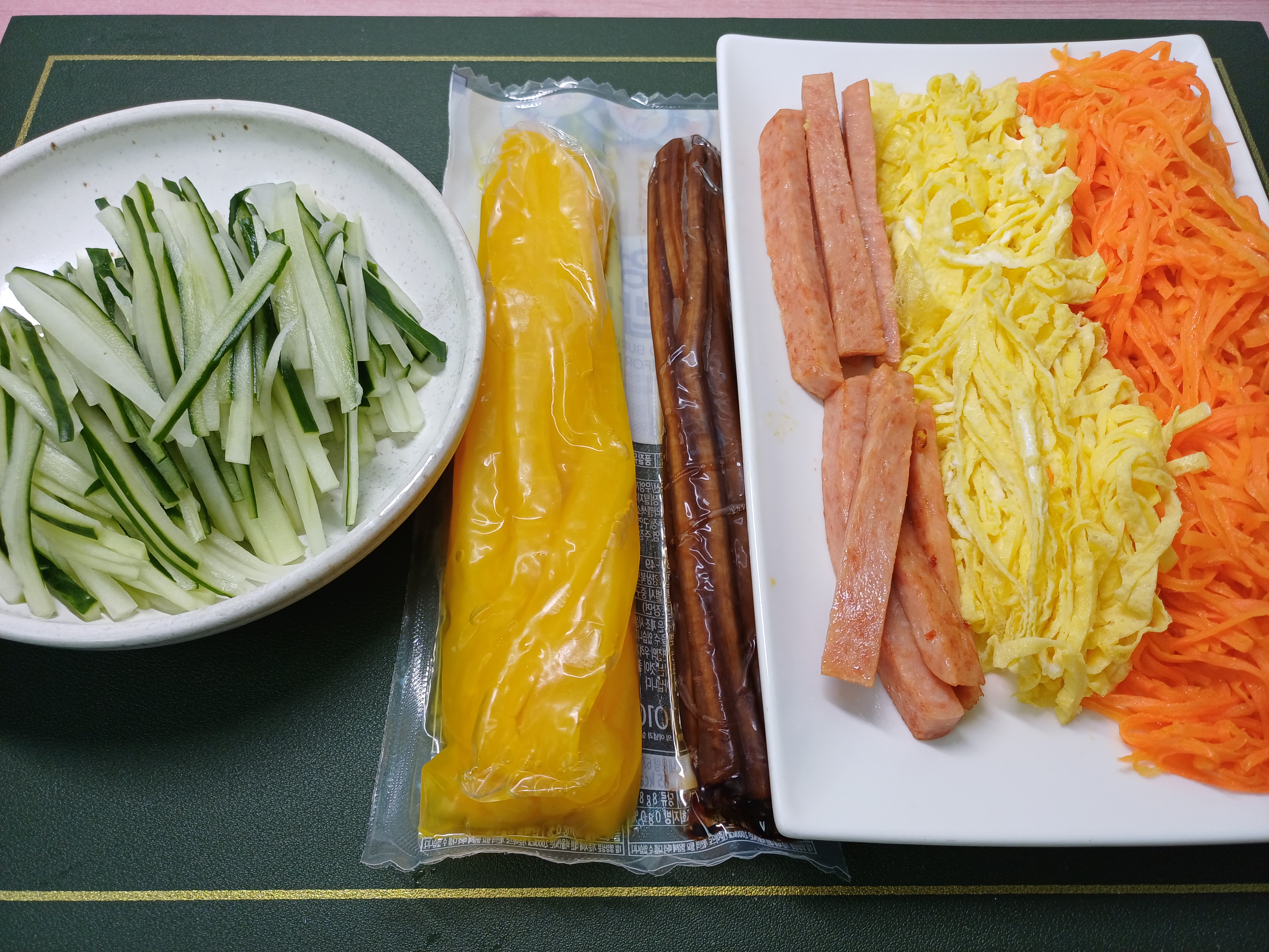 김밥김, 당근, 단무지(김밥용), 우엉(김밥용), 달걀, 햄, 오이