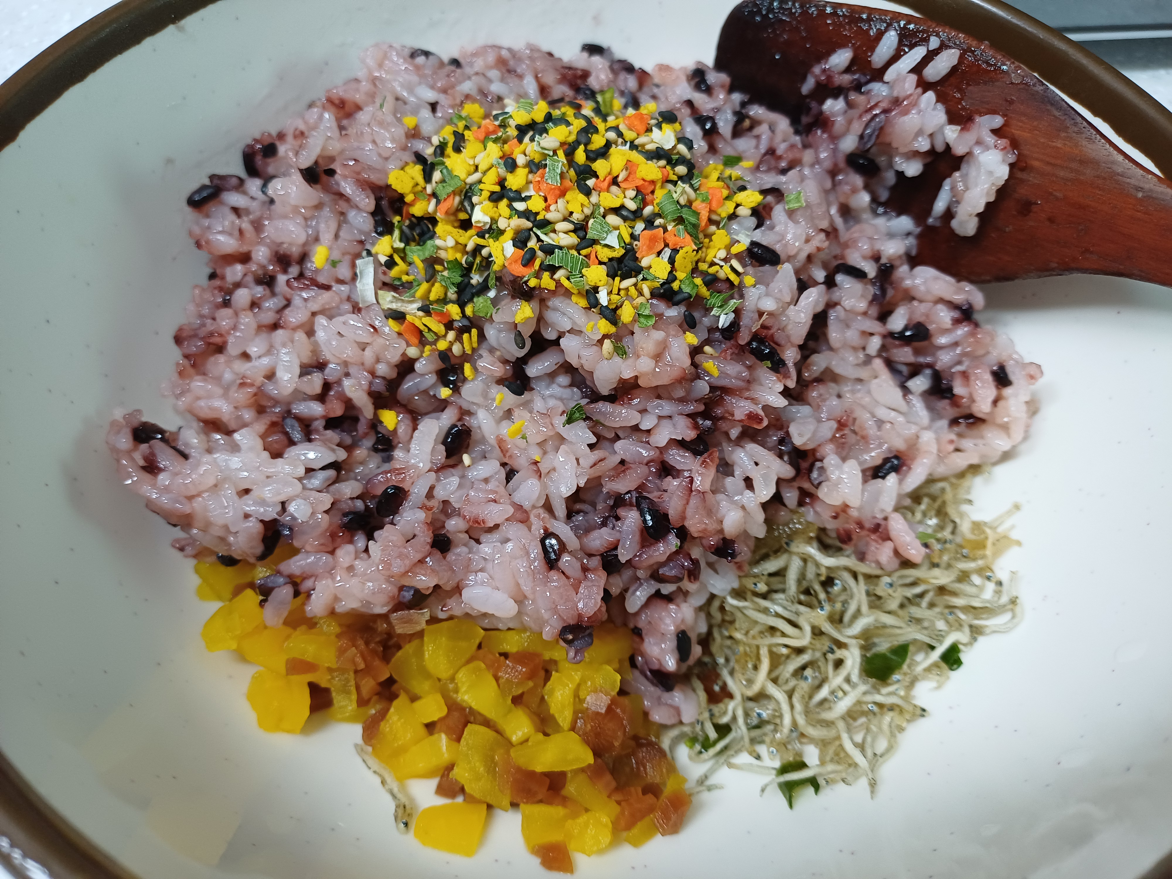 3. 단무지,우엉, 멸치볶음 에 밥 2공기를 넣고 유부와 같이 포장된 조미볶음과 소금 조금, 참기름을 넣고 잘 섞는다. 동봉된 소스는 인공적인 신맛이 강해서 넣지 않았다.