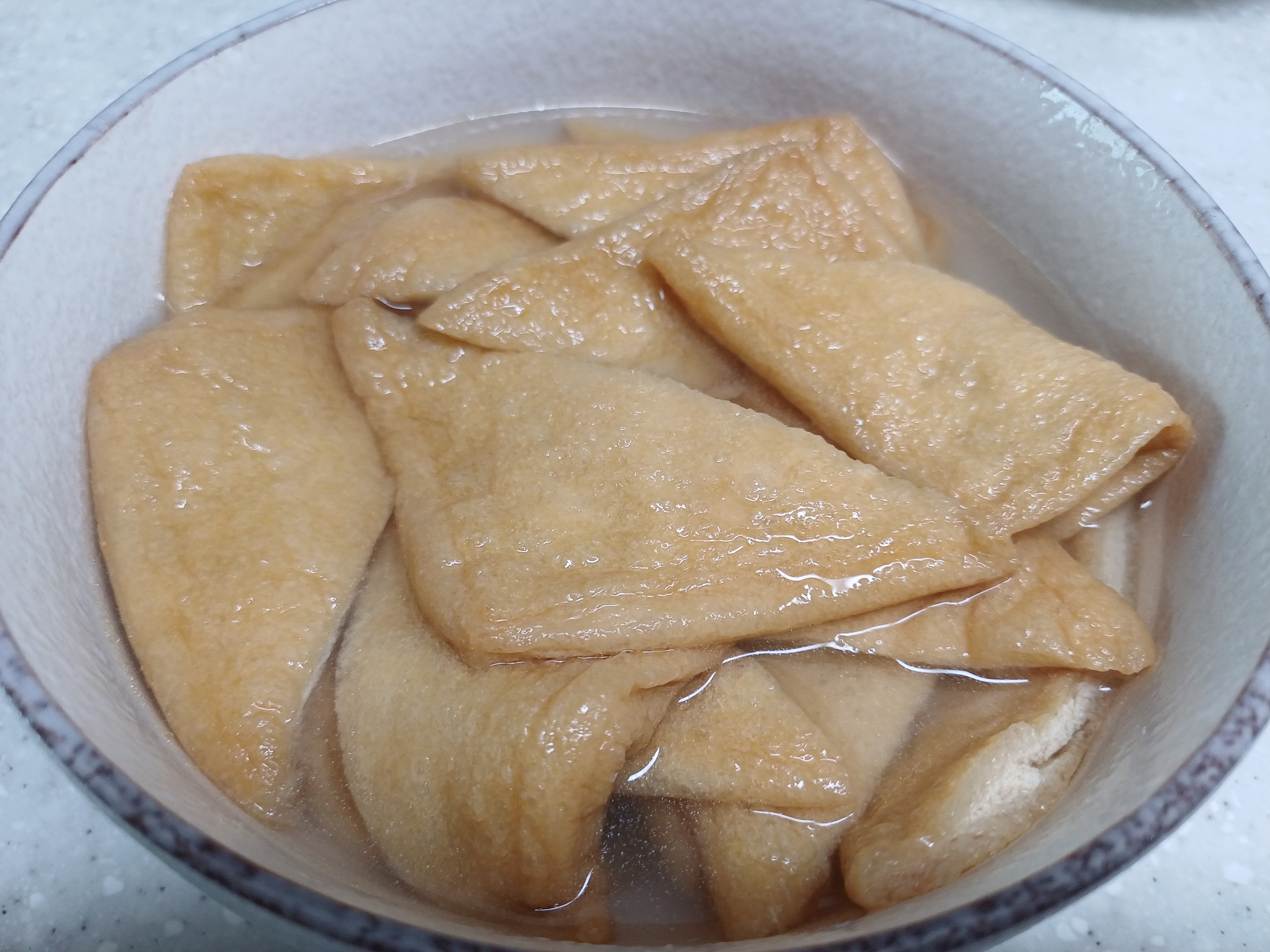 2. 유부는 끓는 물에 담가 기름도 빼고, 유무를 부드럽게 한다. 유부가 부드러워지면 물기를 뺀다.