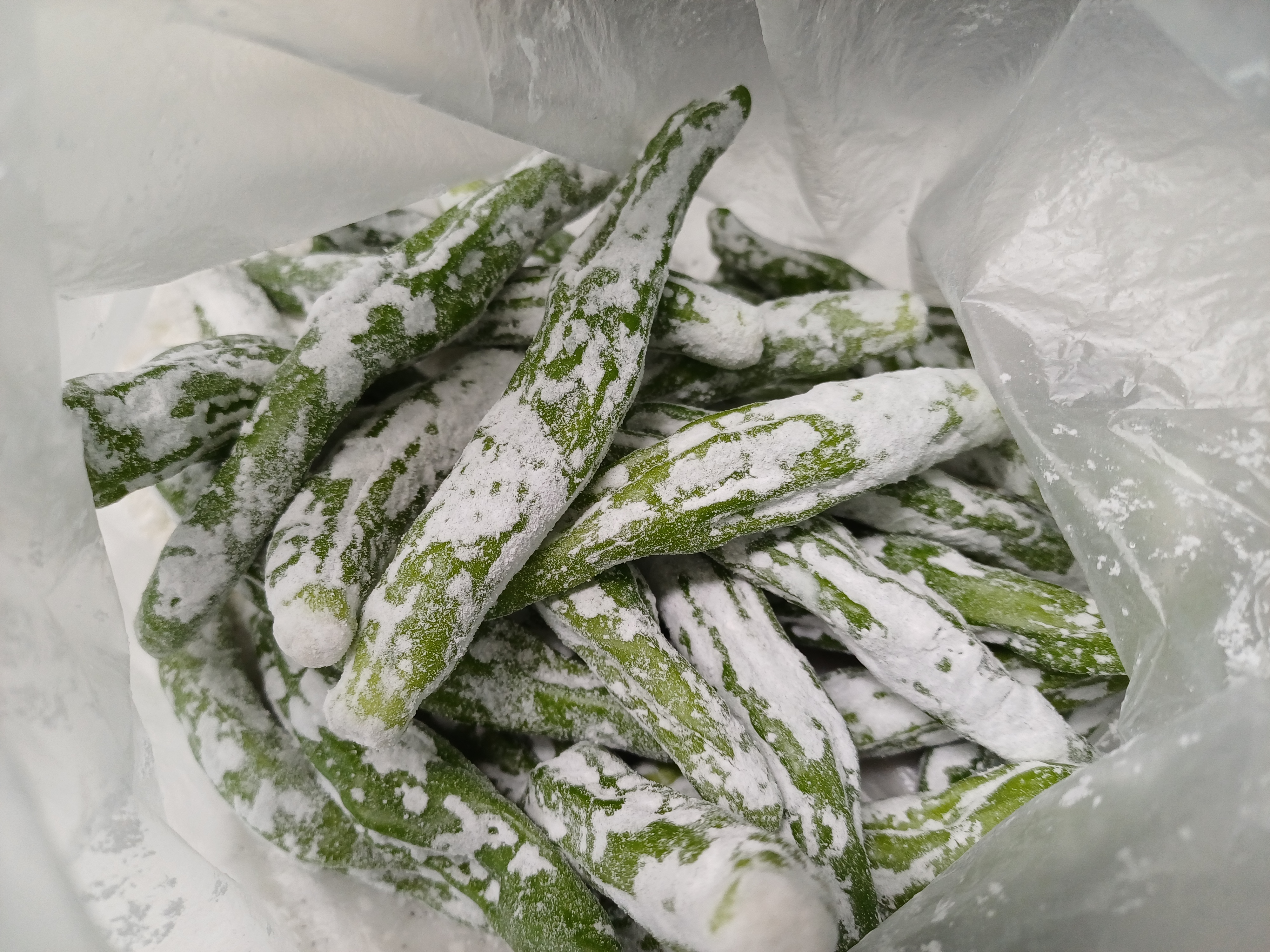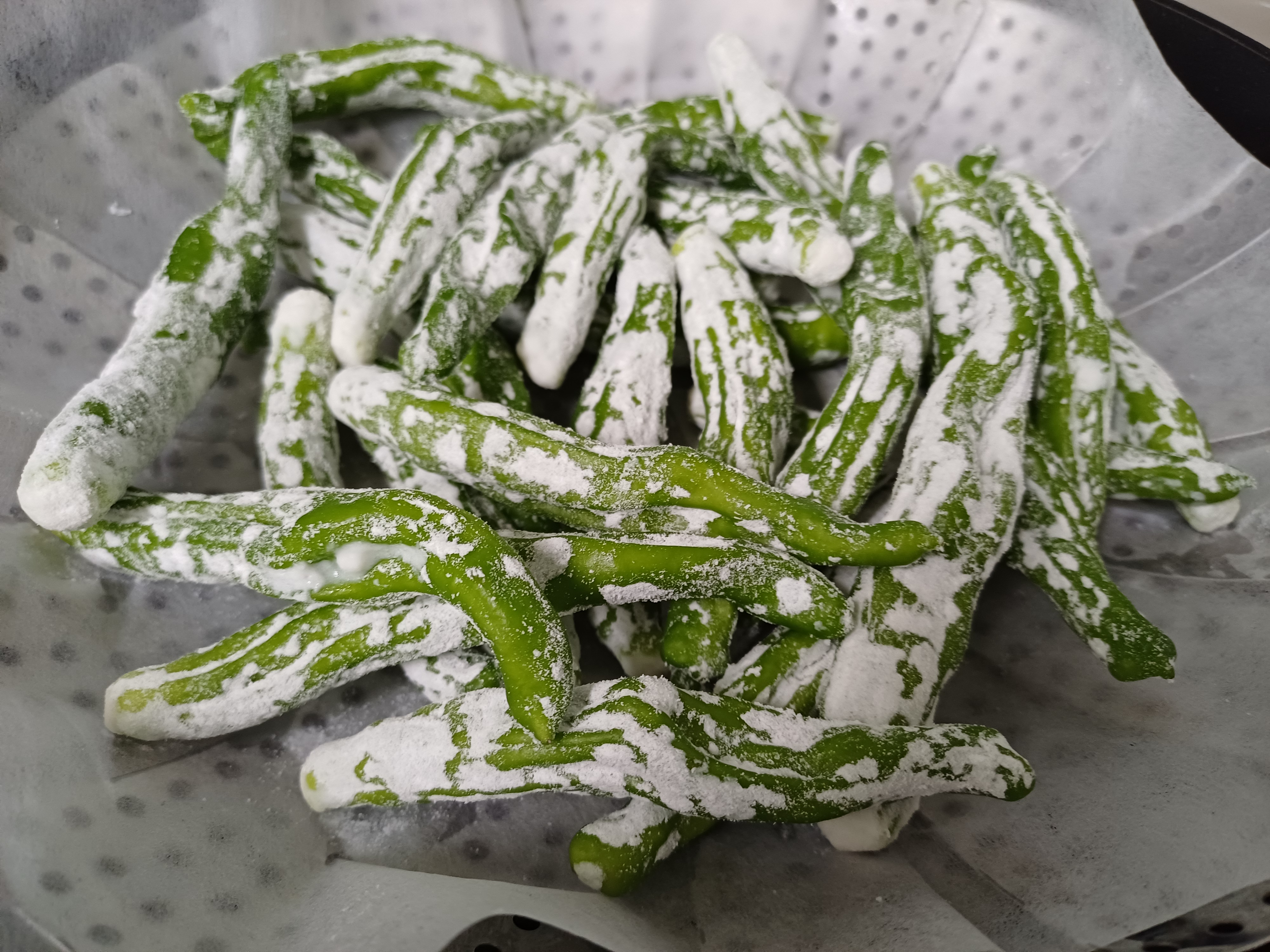 3. 비닐팩에 쌀가루와 손질한 꽈리고추를 넣고 흔들어 고추에 쌀가루를 묻힌다.