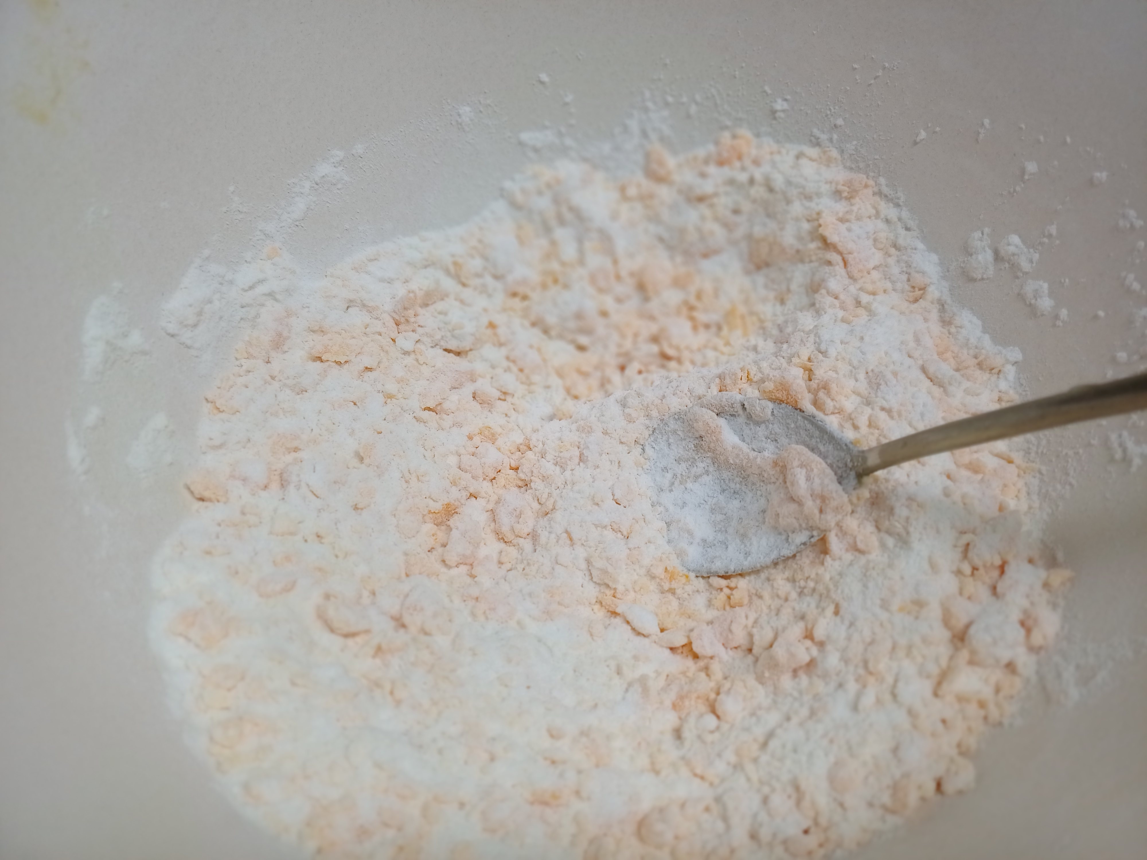 7. 단호박과 섞은 쌀가루에는 끓는 물의 양을 적게 섞는다.
