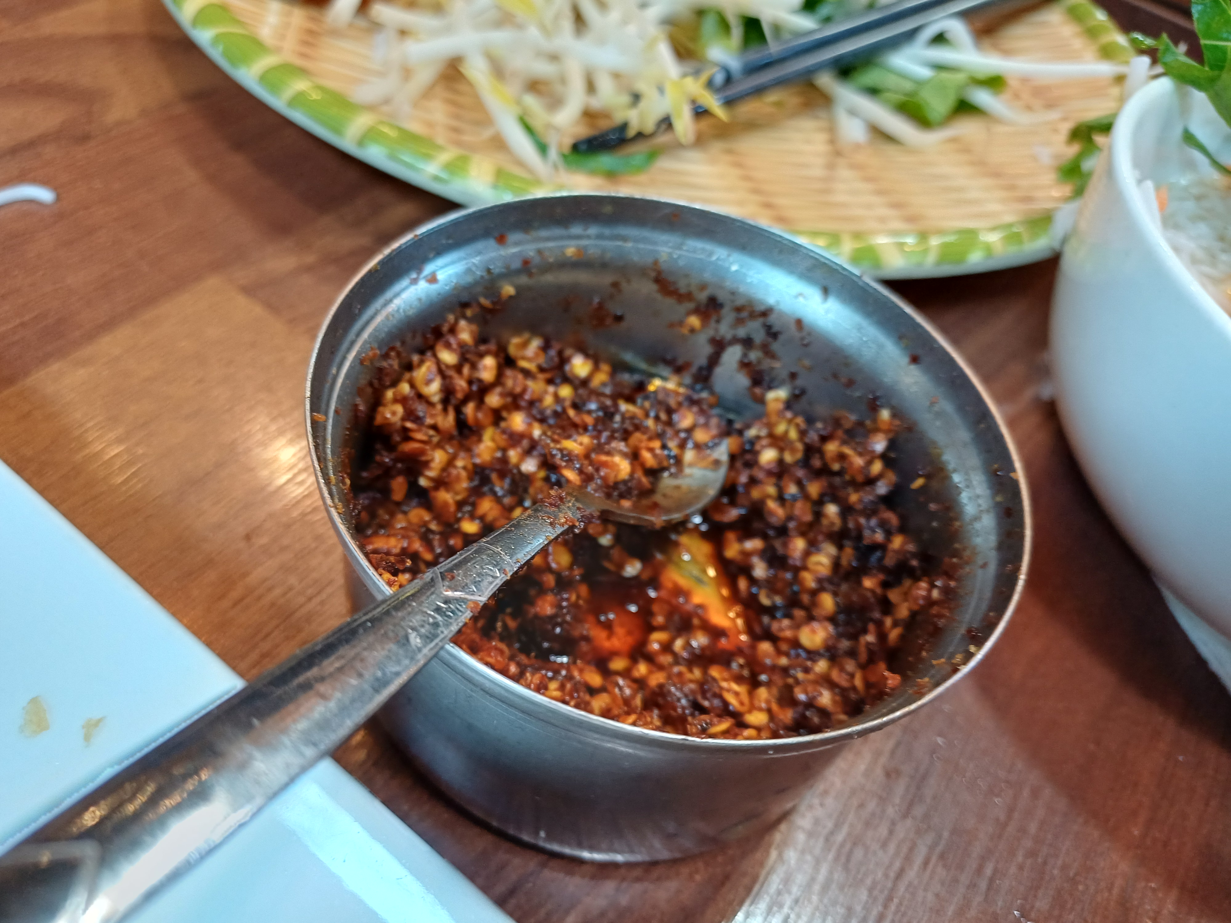 쌀국수의 육수에서는 한국식 쌀국수와는 다른 맛이 느껴졌는데, 그렇다고 거북하지는 않았습니다. 하얀 국물도 맛있었지만 테이블 마다 있는 양념을 넣으면 칼칼한 맛이 더해져 더 좋았습니다. 매운 맛에 익숙하지 않으시면 조금만 넣으시는게 좋습니다.