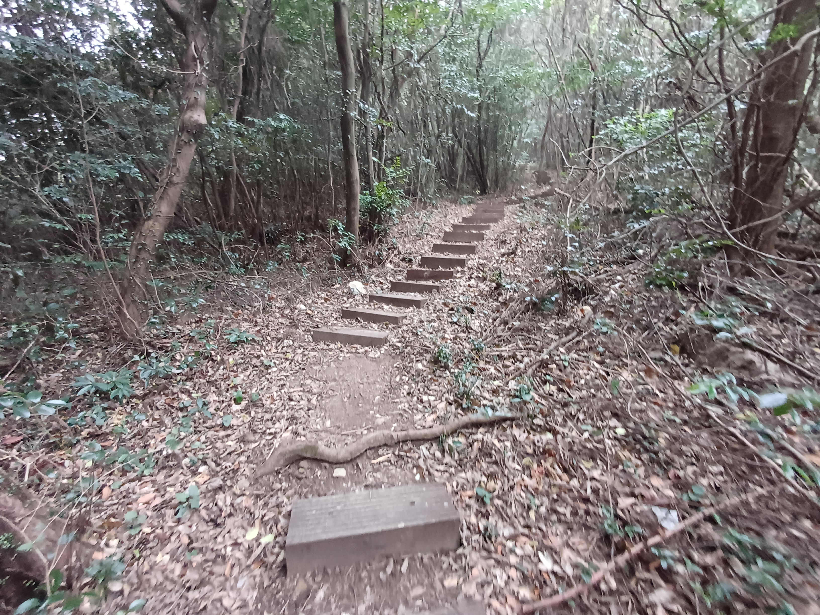 야생의 체험을 한다는 생각이 들 정도였는데, 밀감류 나무와 동백꽃 나무를 지나면 쭉쭉 뻗은 삼나무 숲길이 나오고 그 길을 지나고 나면 오래된 계단 탐방로가 나오는데 역시 관리가 되지 않은 모습이었습니다.