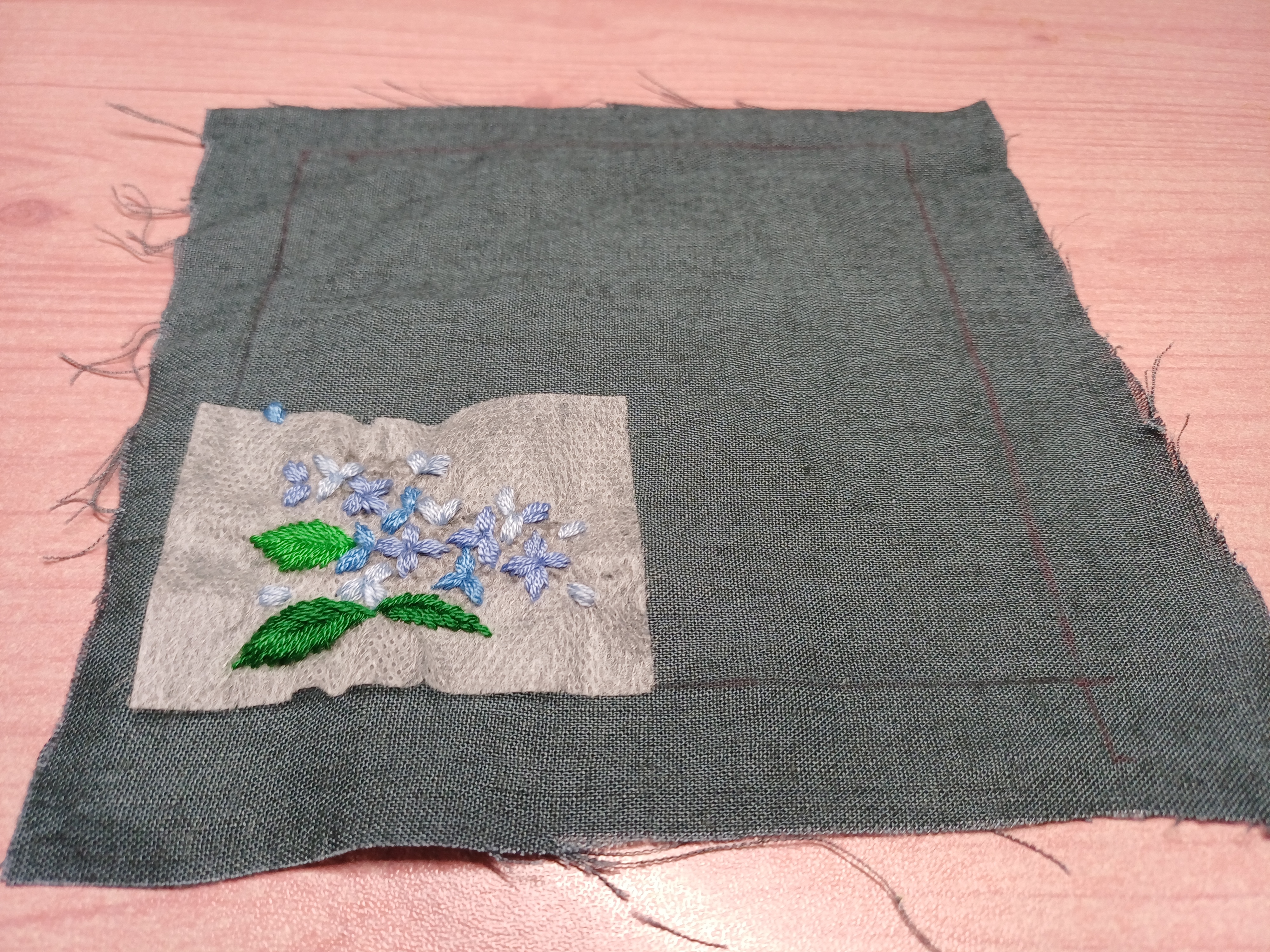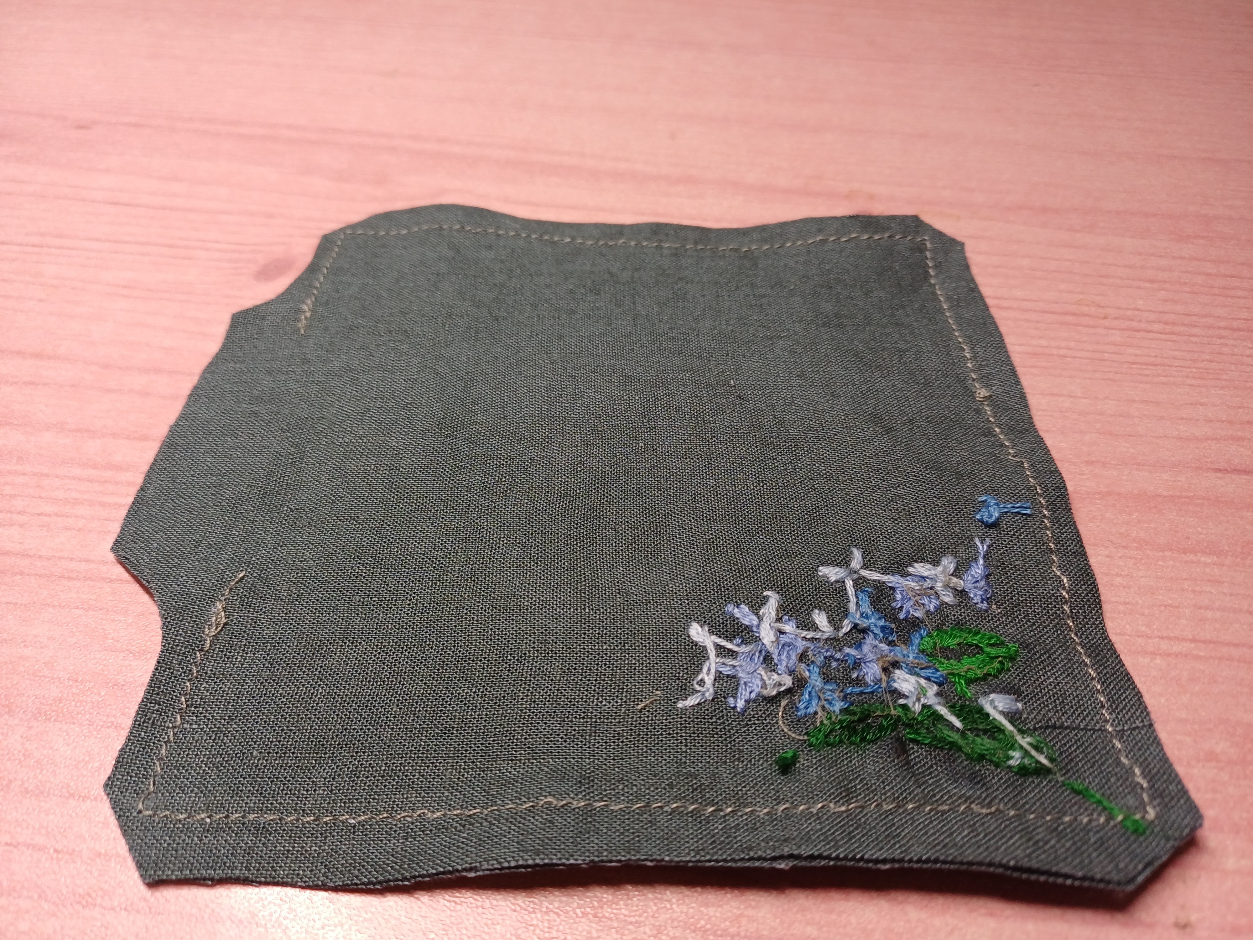 작은 꽃잎들은 새틴 스티치로, 잎은 피쉬본 스티치로 수놓았는데, 크기가 작아 수틀 없이 수를 놓다 보니 수놓는 재미는 덜했던 것 같습니다. 프랑스 자수를 따로 배운 것은 아니고 유튜브 영상 보면서 조금씩 따라하는 중인데 작은 꽃들을 수놓는 방법들이 다양해서 재미있는 것 같습니다.