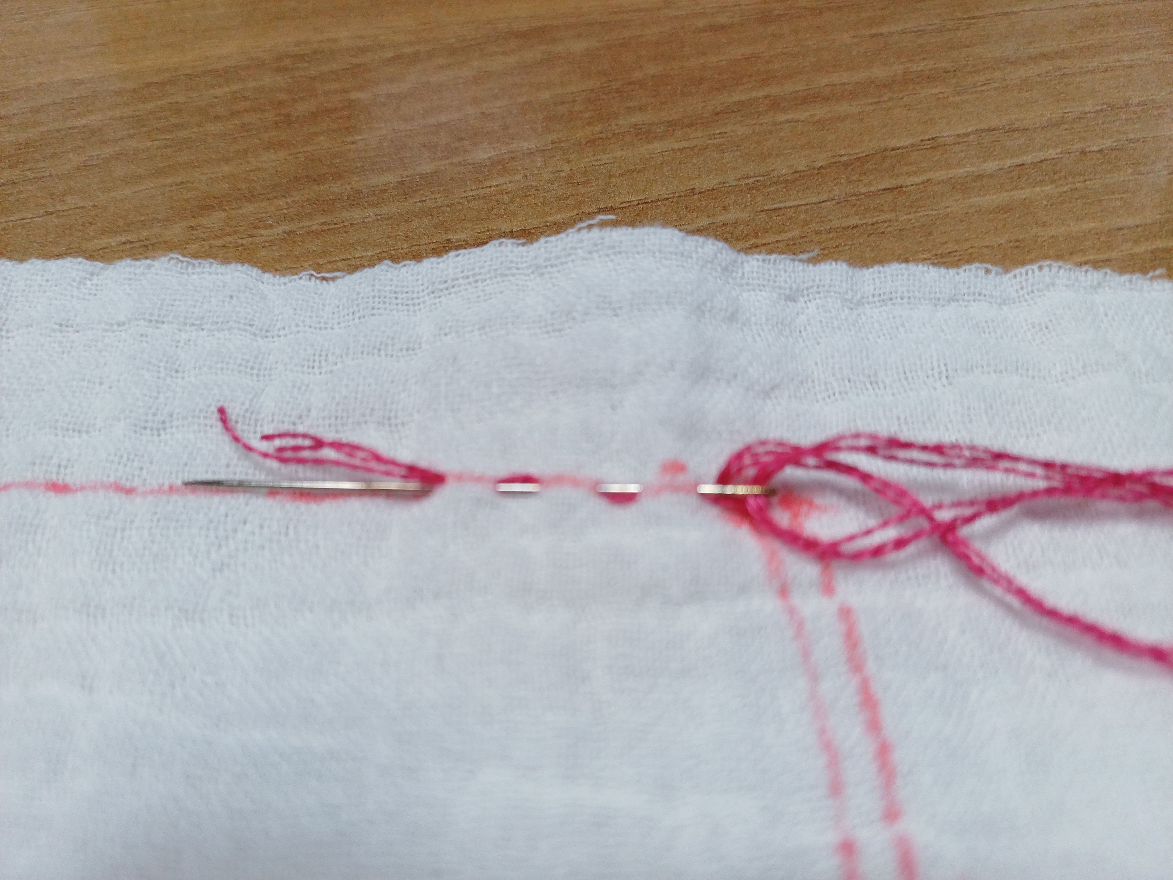 3. 표시한 선에 홈질 자수를 놓습니다.