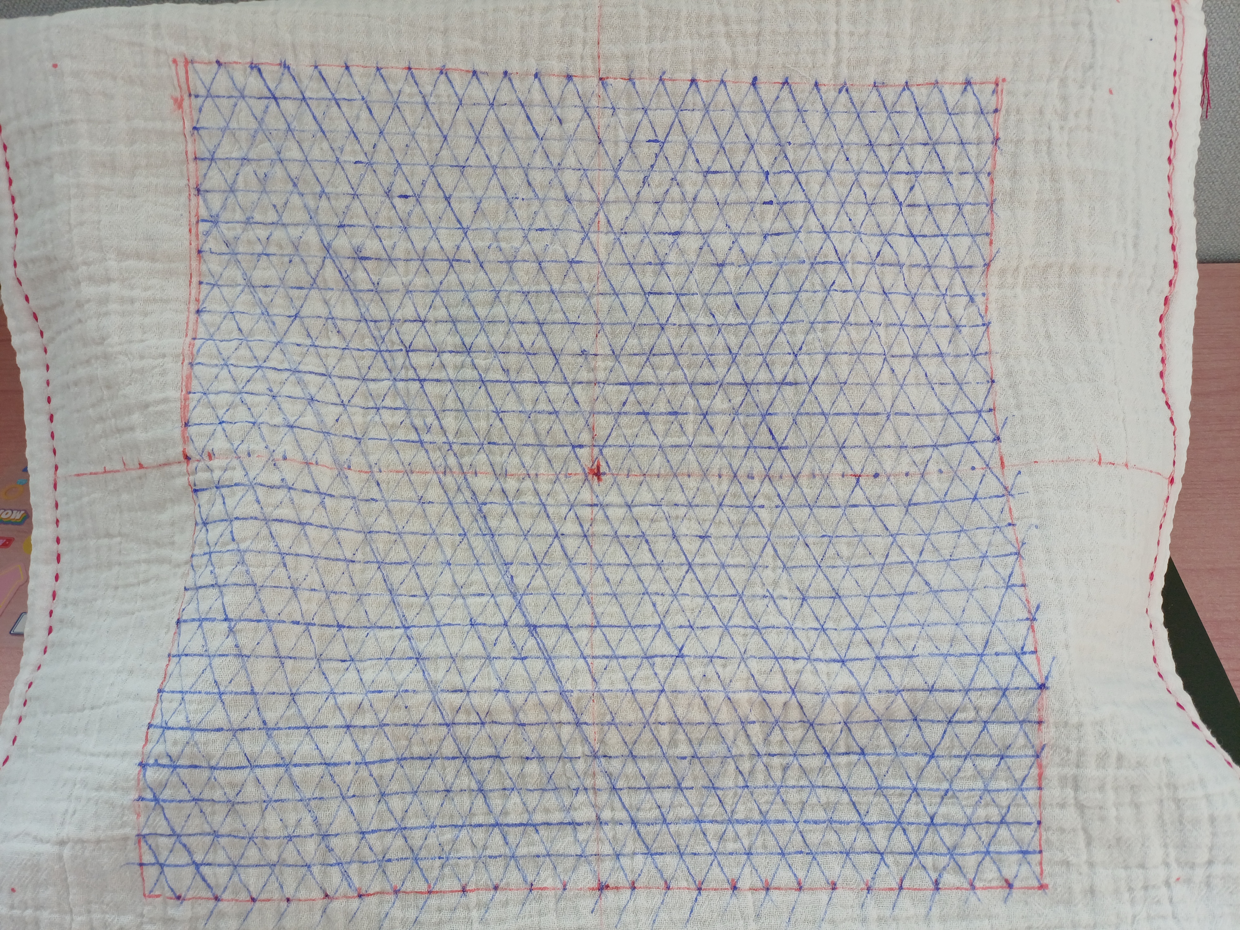 40cm 완성선을 바느질 한 후에 이중면을 양쪽으로 나누어 안쪽으로 접어 바느질 해서 마무리 했습니다. 이중면을 양쪽으로 나누는 게 많이 번거롭기는 했지만 생각보다 깔끔하기는 했습니다. 비벼서 빨아도 튼튼해서 좋기는 한데 원단이 얇아 이중거즈면 사이의 색실이 비치는 건 마음에 안들더라구요. 안쪽의 실이 그대로 비쳐 눈꽃문양의 느낌이 전혀 살지 않아 아쉬웠습니다. 자수 없는 손수건을 만들어도 좋을 것 같았고, 자수를 연한 실로 바꾸거나 안쪽이 비쳐도 별로 거슬리지 않는 도안을 만드는 등 고민을 해봐야 할 것 같네요.