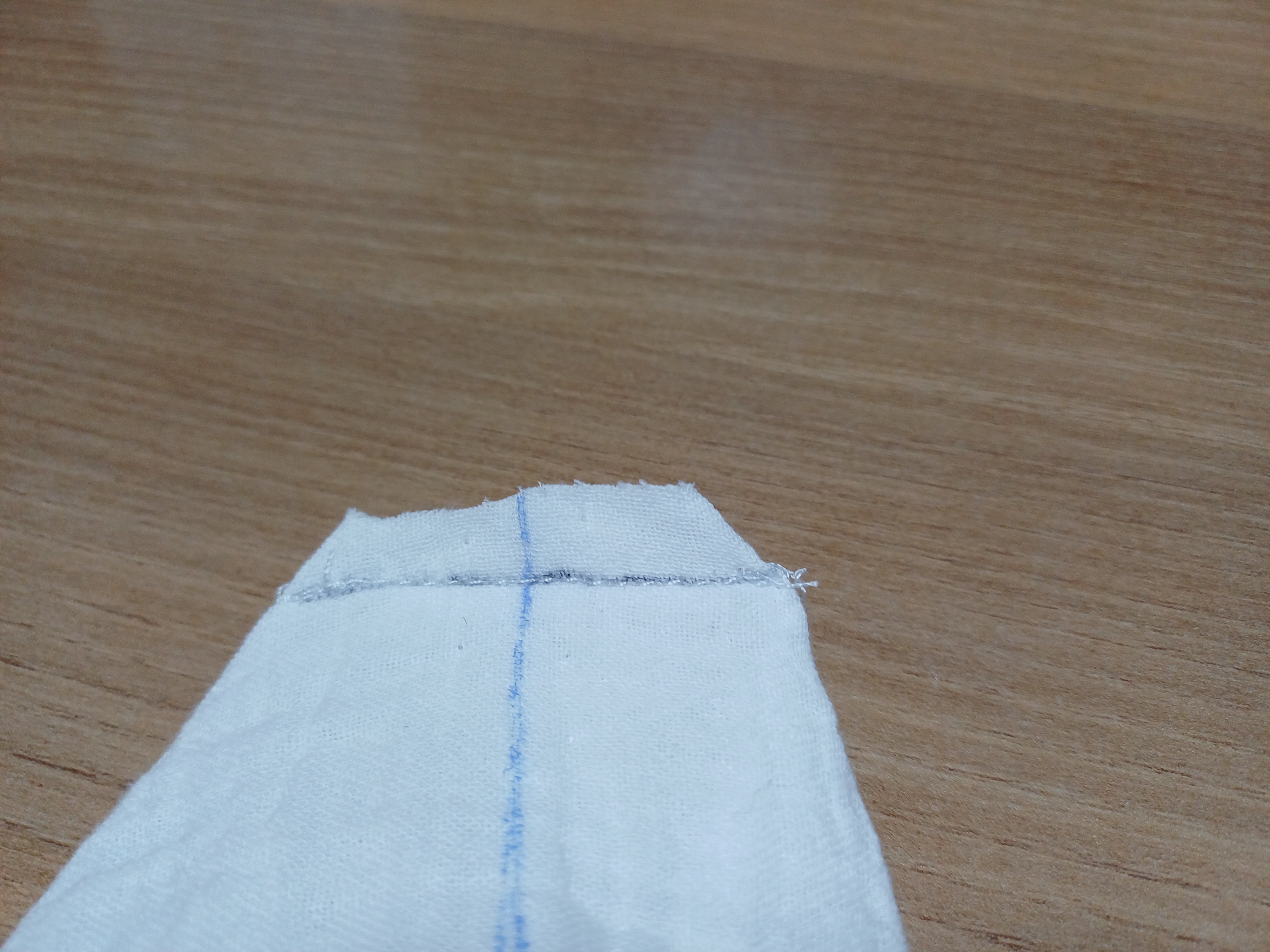 2. 옆선과 밑면의 중심선을 맞추어 모서리에서 4cm 지점에 바느질 하고 모서리를 자른다.