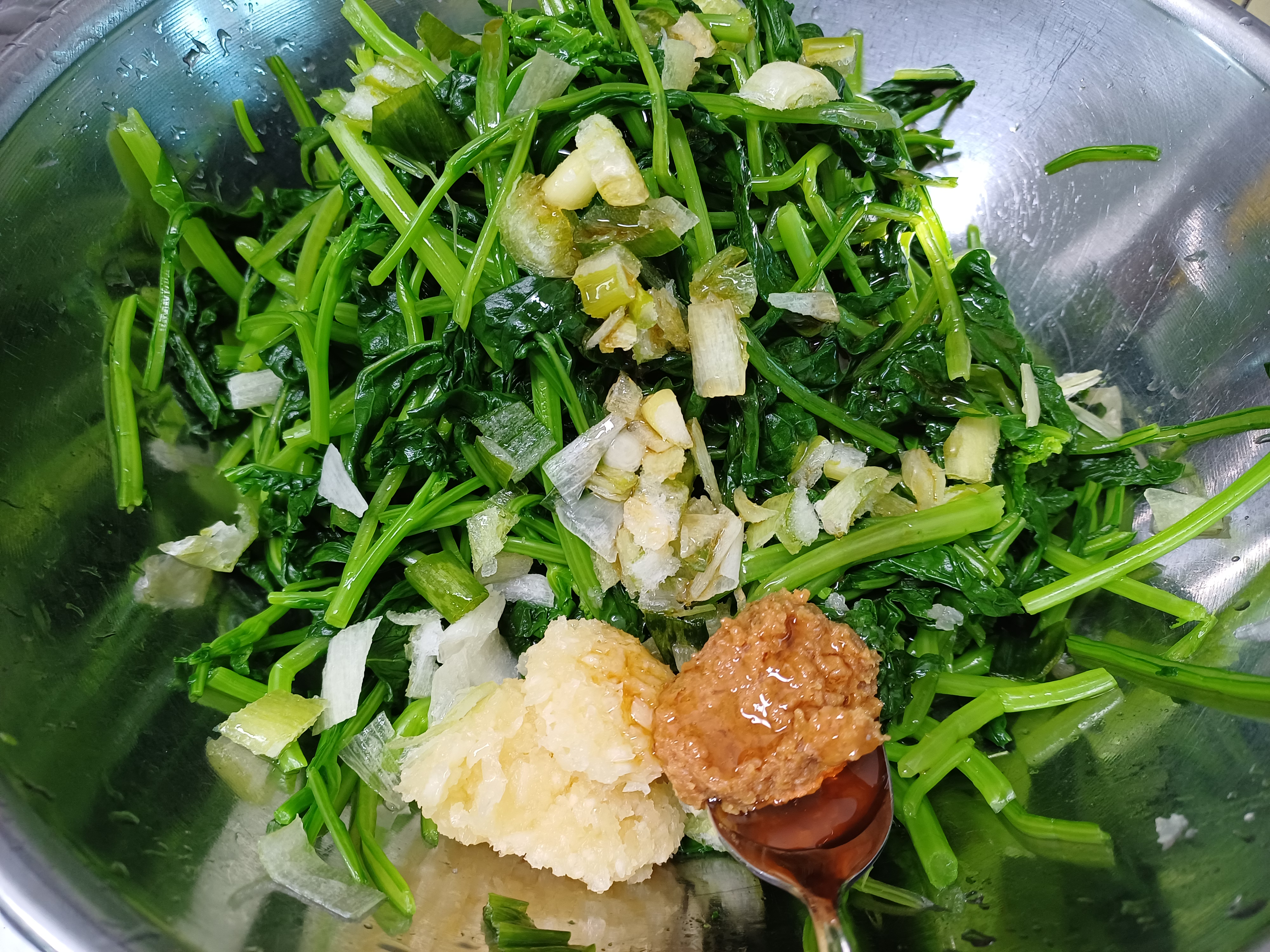 6. 자른 나물에 다진파, 다진마늘, 된장, 참기름을 넣고 무친다.