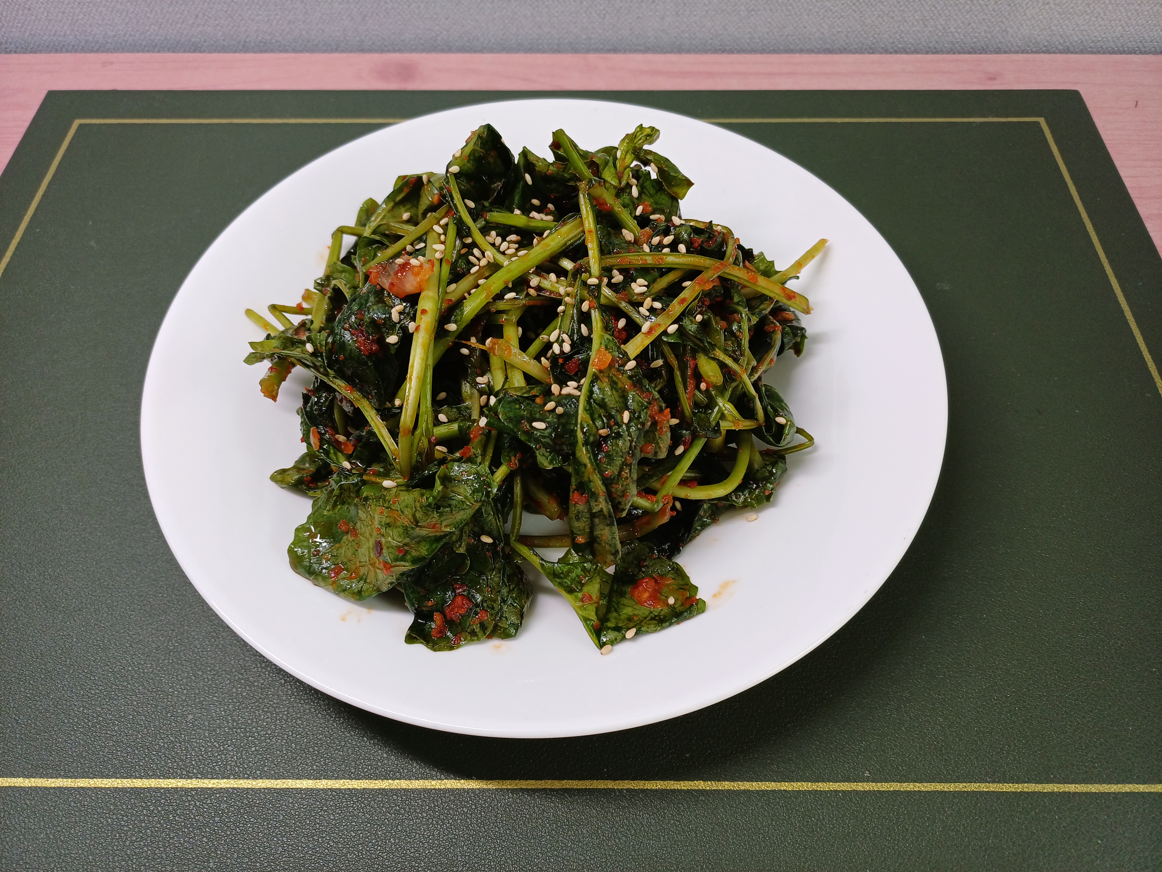 유채나물(300g), 고춧가루 3큰술, 식초 2큰술, 설탕 2큰술, 멸치액젓 2큰술, 참치액젓 1큰술, 다진마늘, 다진파, 참깨