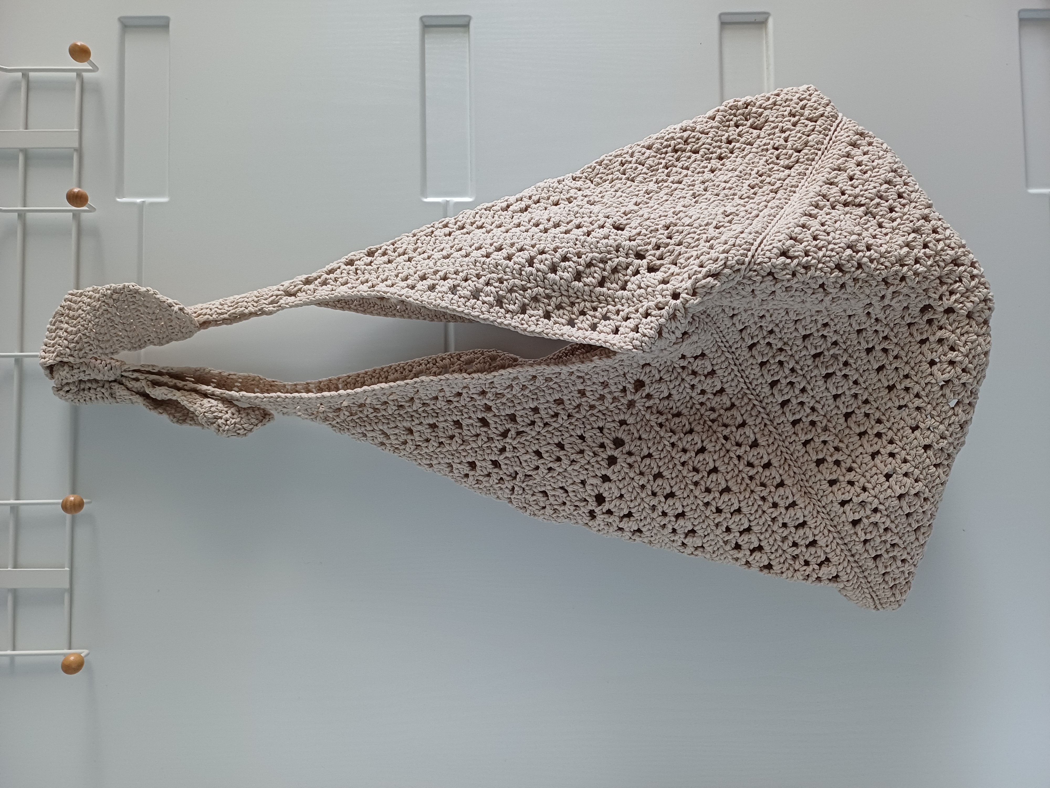 무늬가 있는 모티브라서 실이 모이는 부분은 두터워지는데 모티브와 달리 무늬가 없는 끈 부분은 부드럽게 떠져서 디자인 대로 묶어서 사용하기 좋았습니다. 모티브가 가볍지 않아 톡톡한 느낌이 오히려 가방에 어울리는 것 같았습니다.