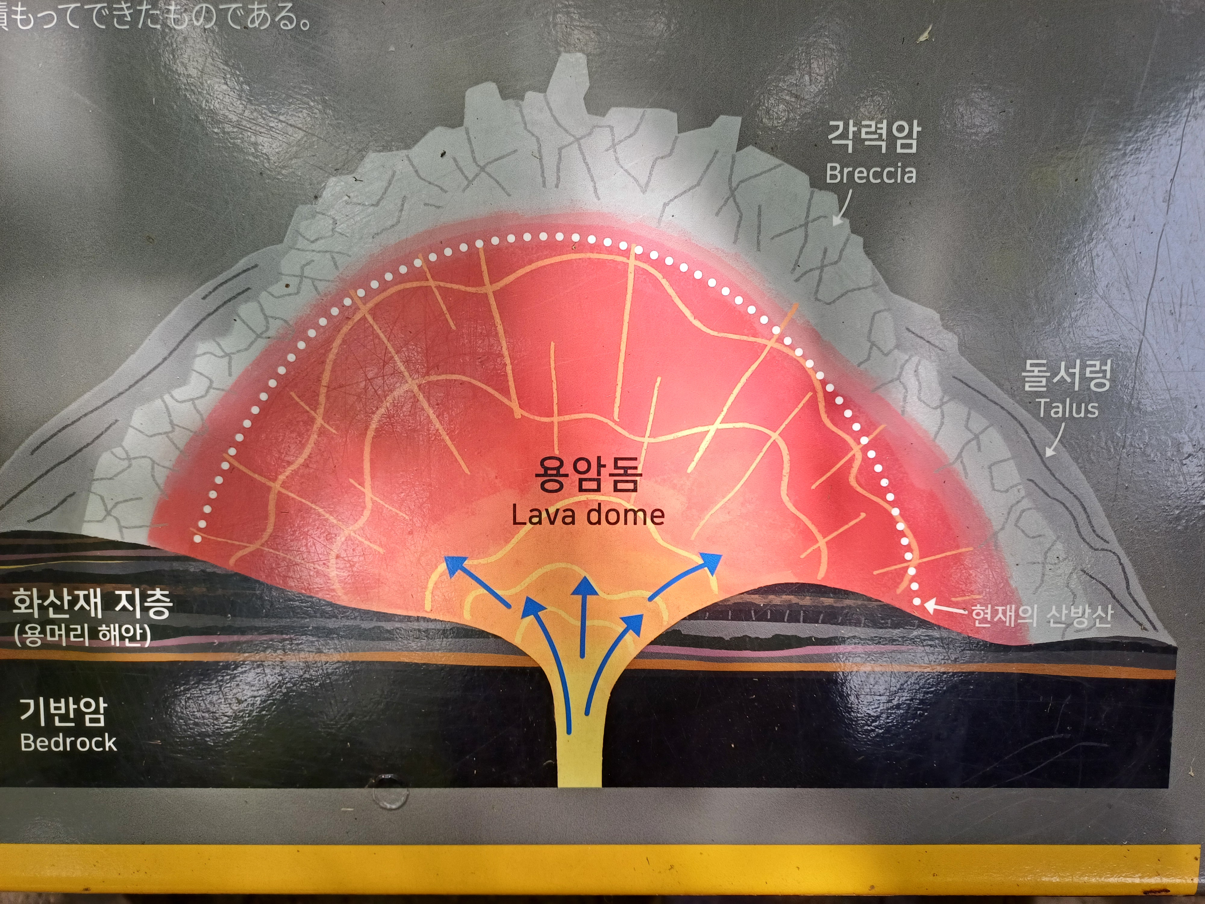 산방산은 395m 높이의 거대한 종 모양의 종상(鐘狀) 화산 또는 용암돔( lava dome) 으로 약 80만년 전 점성이 매우 큰 조면암질 용암이 화구로부터 천천히 흘러나와 멀리 흘러가지 못하고 굳어진 것입니다. 용암돔의 내부에는 수직의 주상절리가 잘 발달해 있습니다. 용암돔의 아랫부분에는 조면암 파편들로 이루어진 돌서렁( 화산각력암층)이 나타나는데, 이는 용암돔이 형성될 당시 돔의 일부가 폭발하거나 무너져 내려 만들어진 것입니다.